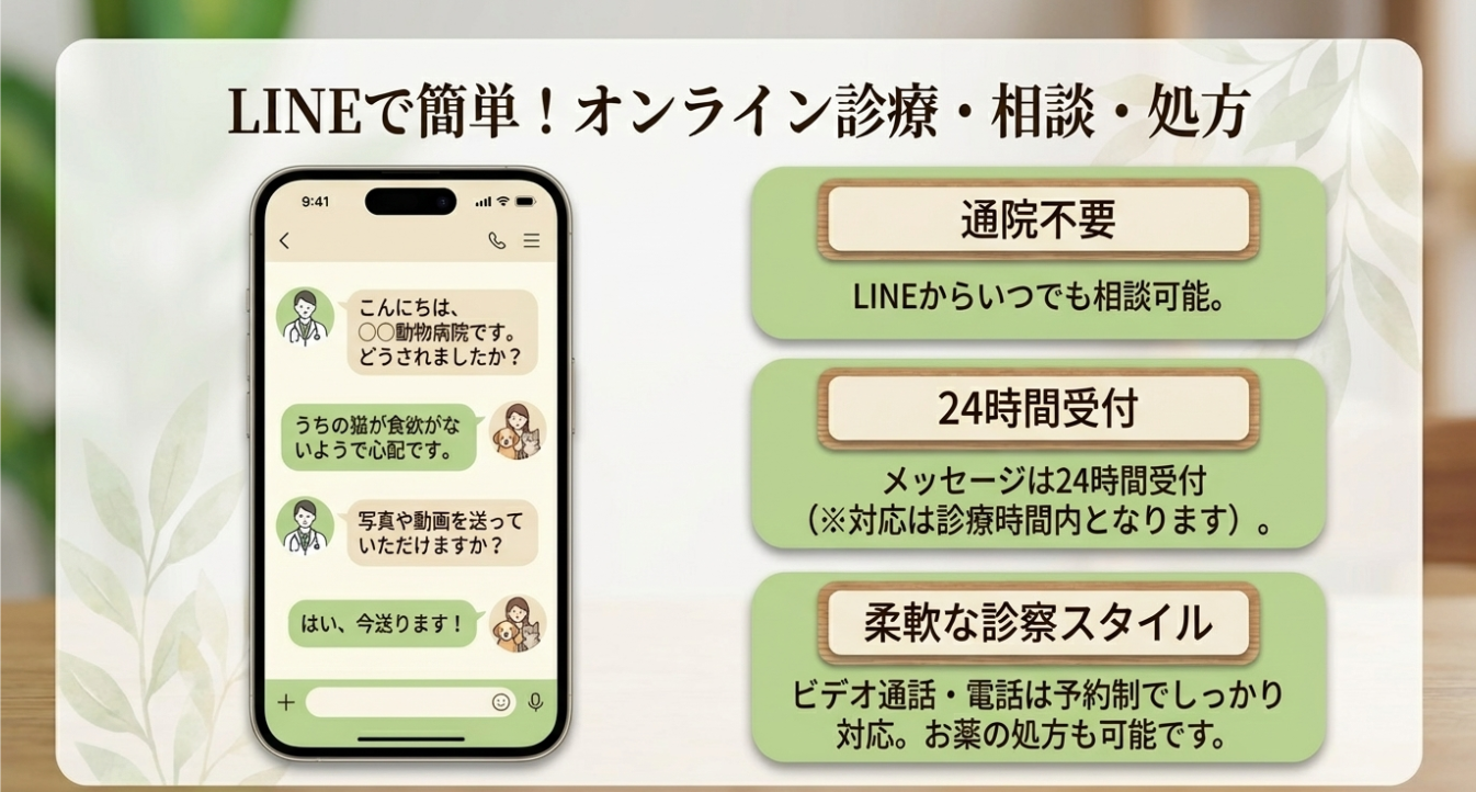 往診・オンライン診療相談を行う動物病院です